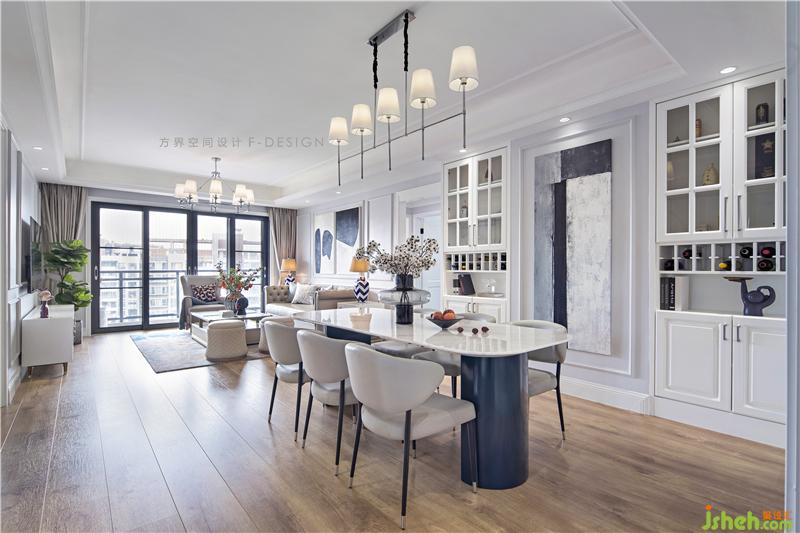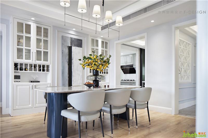 光影交错的挂件丰富了空间层次,并与银色餐灯相呼应。大理石台面的餐桌为空间注入现代气息,现代与美式的结合,家具的选择更有包容性。