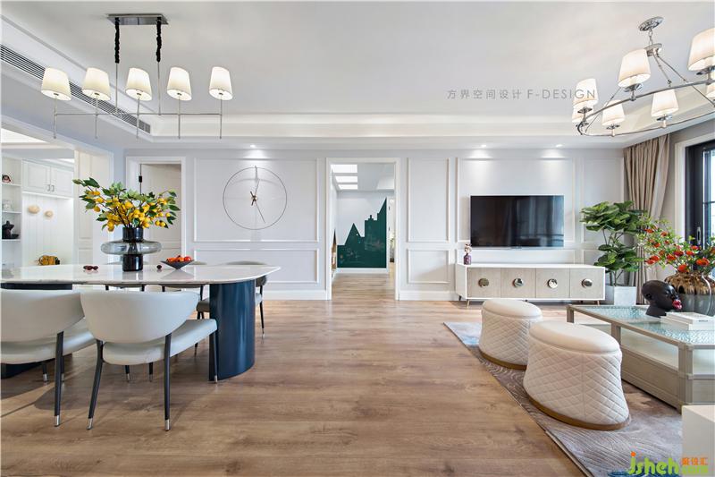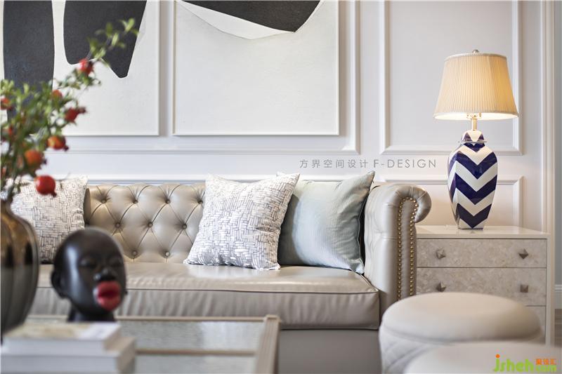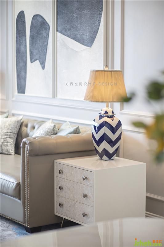 对灰色系的把握恰到好处,家具选用不同程度上的灰色,黑白大色块的挂画与冷灰色界面完美融合,黑白条纹的台灯与其呼应,花艺作为唯一点缀色,提亮了空间整体色调,空间感觉干净,不做作。装修设计