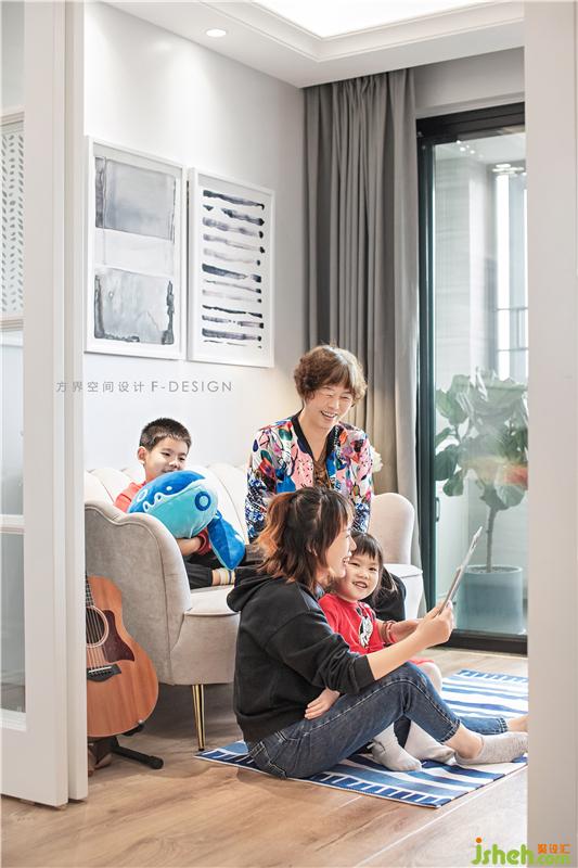 书房兼具办公与偶尔休憩的功能。弹吉他是男主人的爱好之一,休息时在沙发上弹弹吉他听听音乐,看妻子为孩子讲绘本,一切的疲惫不堪在瞬间被治愈,这是幸福的模样。装修设计