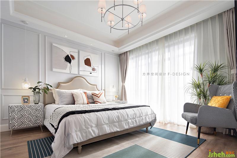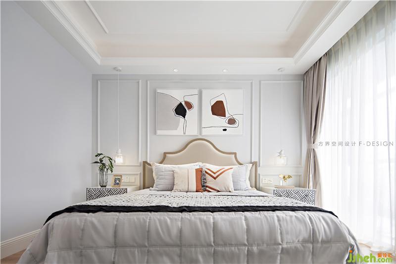 沿用空间主体色调,把红色作为点缀色,为空间增添有彩色。床头柜黑与白的碰撞,图案元素的重复组合,繁而不杂。绿植的摆放恰如其分,为空间带来生气。