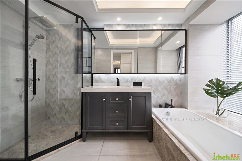 良好的采光,大块面的镜面,界面几何砖的拼接,在视觉上延伸了空间感。主卫收纳空间充足,功能齐全,不同的材质在色调上达成统一。装修设计