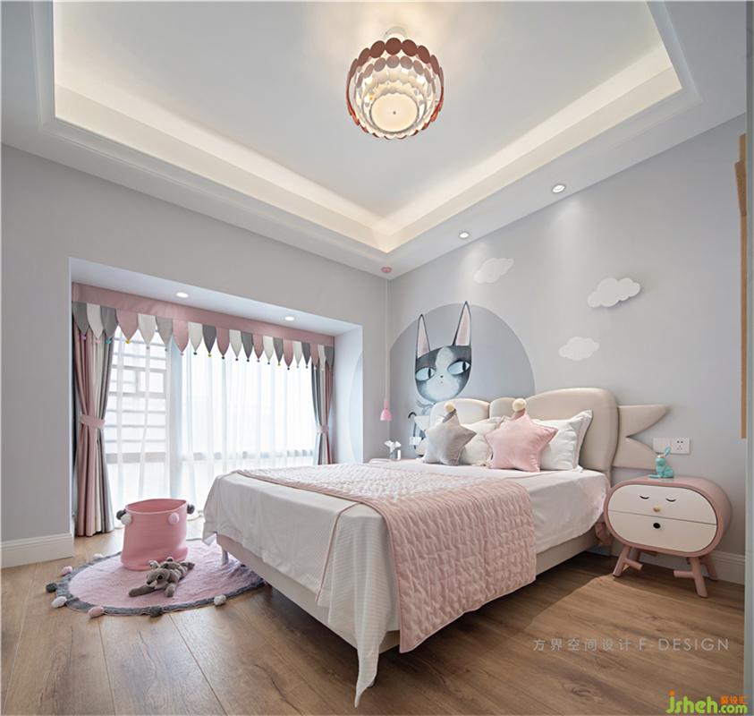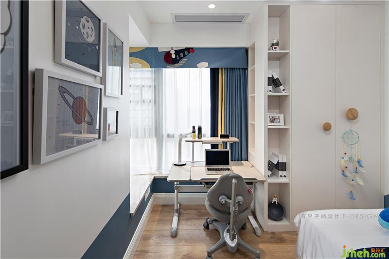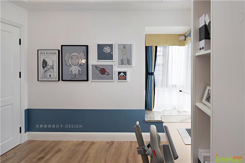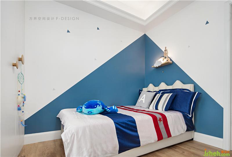 “鲸鱼宝贝是妈妈在我刚出生的时候买给我的”,男孩跟我们开心的分享。男孩房选用蓝色作为主题色,蓝色是大海的颜色,纯净,宽阔。男孩房没有做太多的装饰,墙面只是简单的几何拼色,只有最单纯的颜色才能唤起最强烈的心灵感受。
