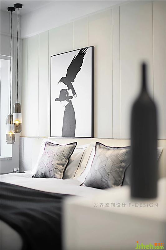 主卧整体偏向黑白相间的简洁色彩运用,突出舒适的氛围,整体简洁干净,吊灯文艺感十足,没有过多色彩的混合,也没有累赘细碎的装饰,隐形线条衣柜把手,和空间很协调,以得体大气之态,打造休憩之地。室内设计师