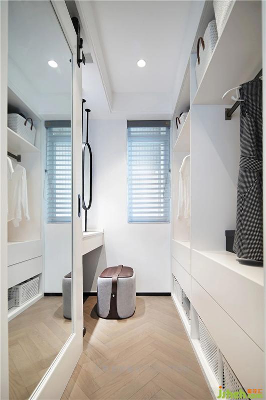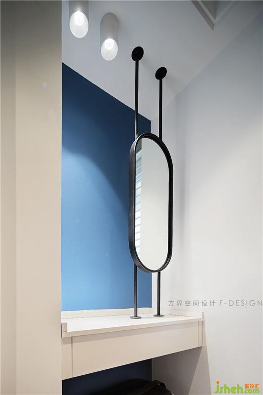 左侧的谷仓门左移后就是过到卫生间的空间,我们在这里做了个套间的功能,可开可合的空间里有多种可能性衣帽间必备一个梳妆区域,梳妆台搭配个性实用镜子,看似简单却极具品味,空间虽小却也不拥挤,暖色调的光线提升衣帽间格调。