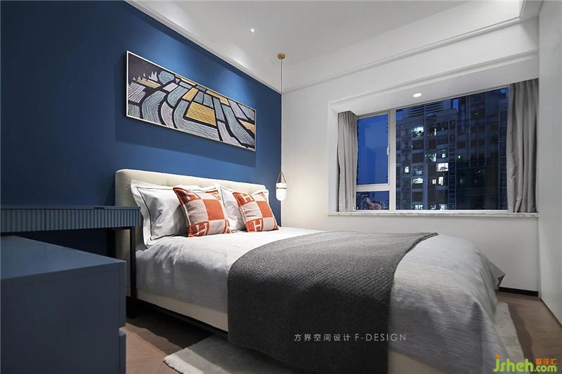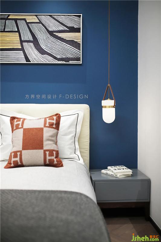 床头一侧吊温馨小吊灯,增加氛围光。房间没有太多的装饰物,采用极简的配色,追求空间宽敝,而以蓝色为床头背景墙颜色作为点缀,活跃了空间,空空的墙面,搭配挂画,在极简中生出乐趣。