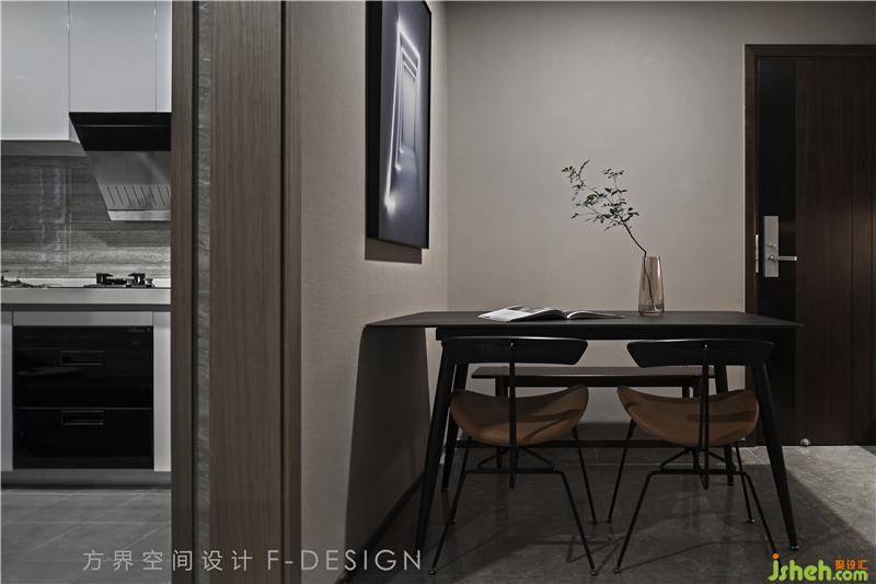 方界设计在餐厅上没有过多装饰性的表达,颜色也较素雅,餐椅在灯光的照射下形成光影,为餐厅增强了线条感。给空间增加了几分律动。
