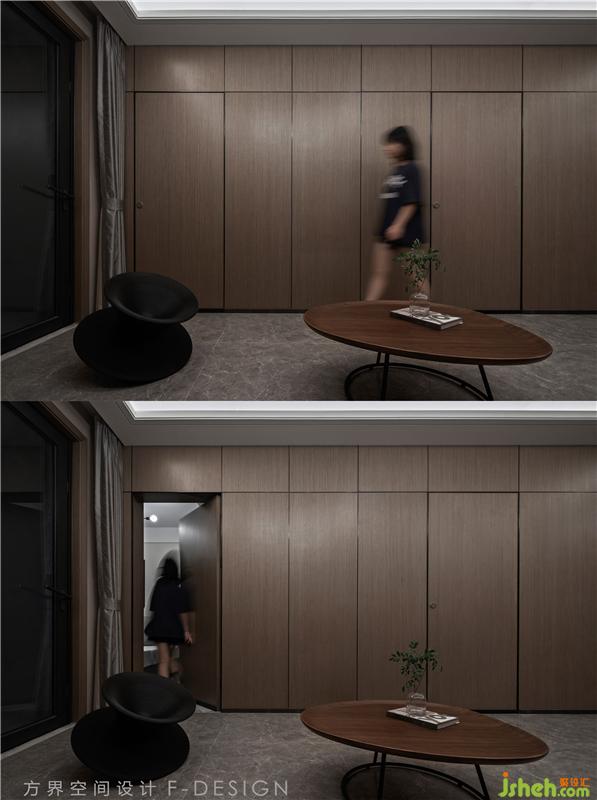 客厅没有添置繁琐的软装,一整面护墙板,让空间完美过渡。卧室顺势被隐藏在了护墙板身后,隐形门的设计保证了空间的整洁与完整性。