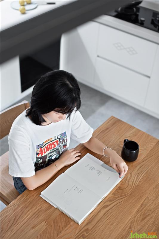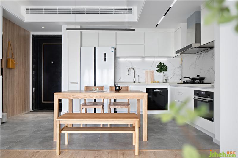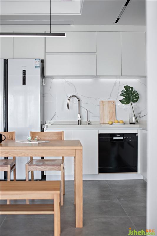 开放式厨房,材质上的软硬对比,宽敞的空间,干净的墙壁,白色的橱柜,整体干干净净,使这个厨房简约,而又不简单。