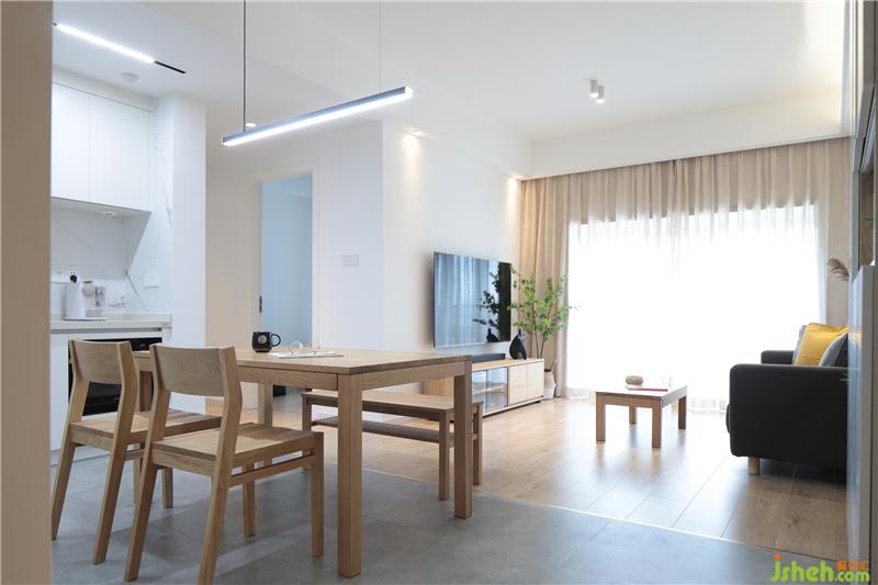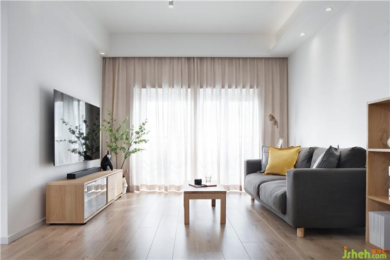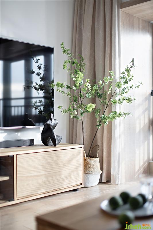 全屋以白色与原木色穿插交错,大量留白的空间让视觉放松下来,化繁为简,摈弃过多的修饰,营造出安静淡雅的气质。窗帘采用米白色布帘,采光好且更显温柔雅致;生机盎然的几处细枝绿叶,为静谧平和的空间增添一抹生机与活力。