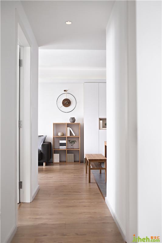 主卧与卫生间之间的过道看向客厅。过道也延续了整体空间的色调,素白的墙面,极简的挂钟,与整体氛围搭配十分和谐,空间层次丰富起来。