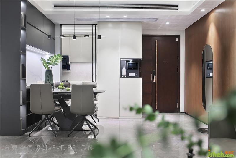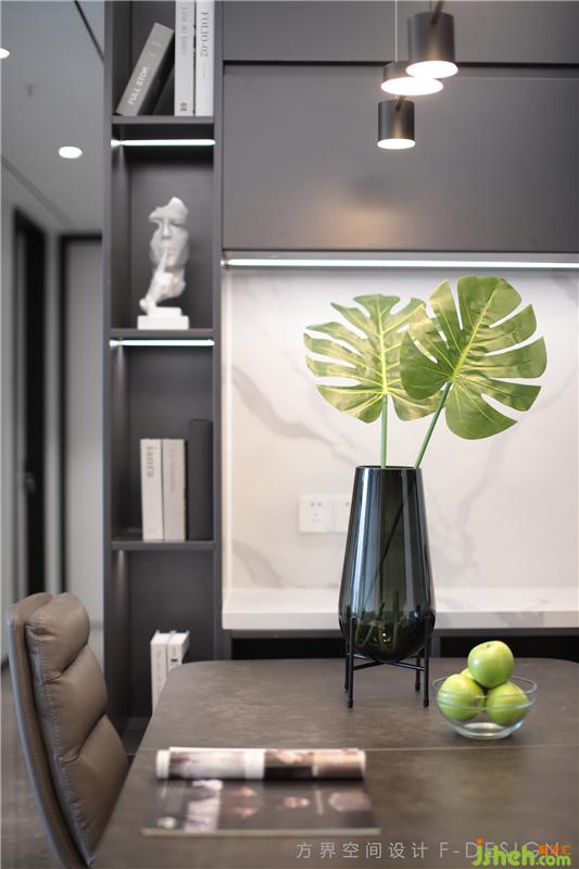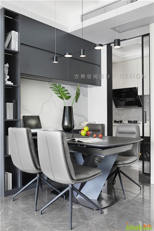 餐厨为了避免油烟沾染,厨房采用黑色钢边玻璃推拉门筑起分隔。