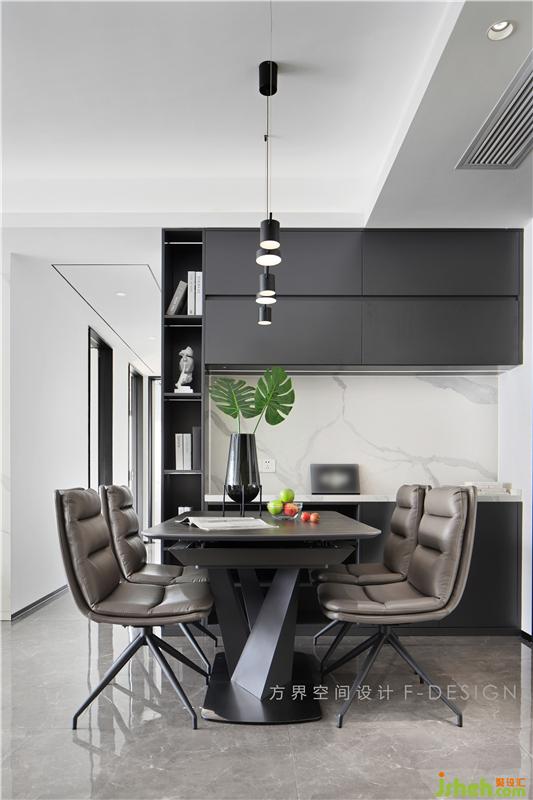 餐厅上方的简约直线吊灯,让空间显得高级感。淡雅温润的灯光在不打破现代感的基础上,深圳室内设计师为空间赋予了柔和色彩。靠墙的餐边柜,收纳井然;不仅提升了美观性,还增加了一定的收纳功能。