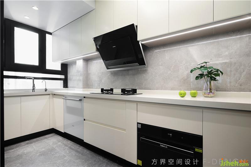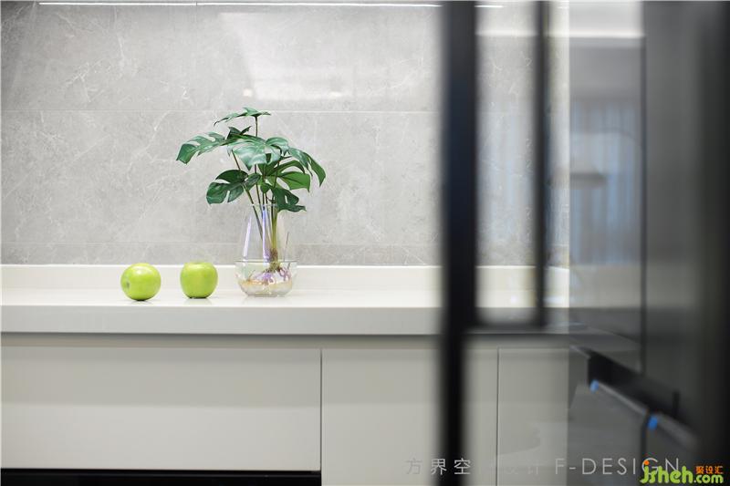 厨房的边柜设计,增加了储物空间,结构精简没有过多的修饰,纯净的空间,勾勒出一个精致时尚的烹饪空间。