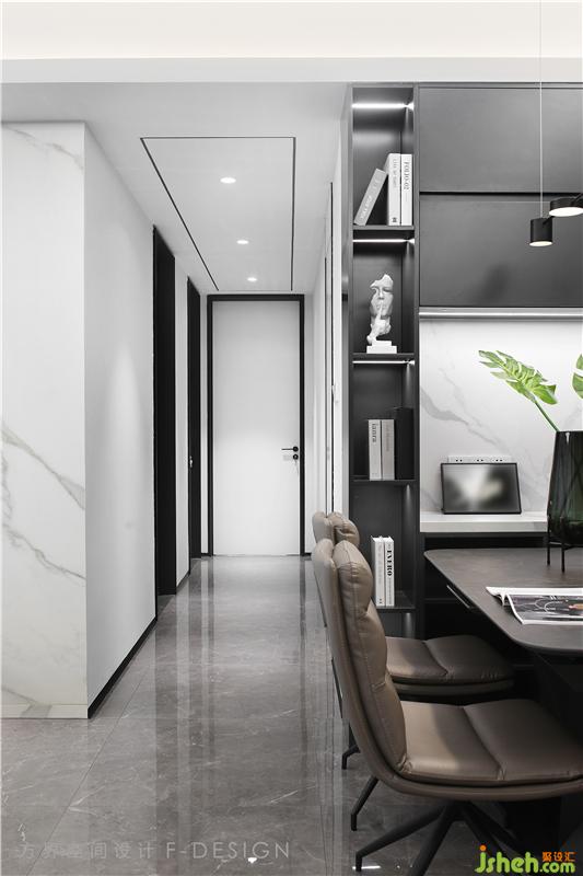 通往卧室的过道。过道运用简洁利落的黑色窄边框门构成,现代风格元素突显而出。