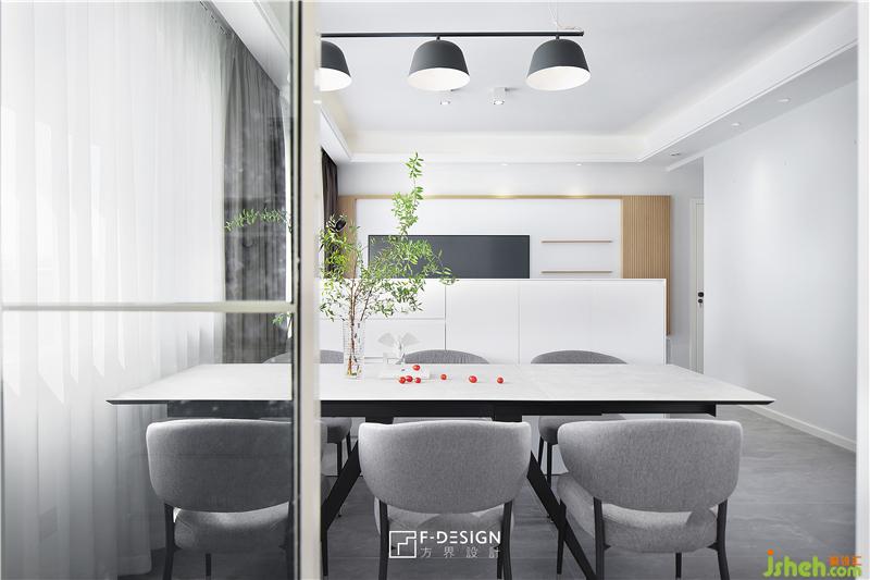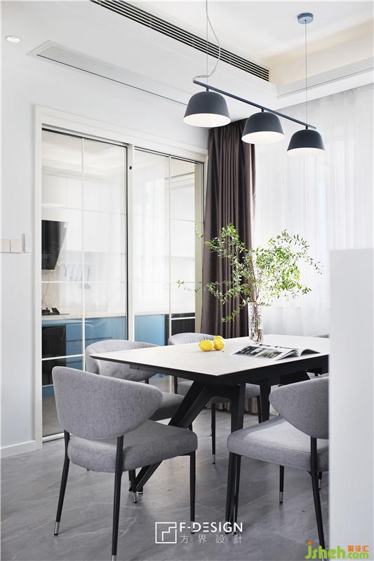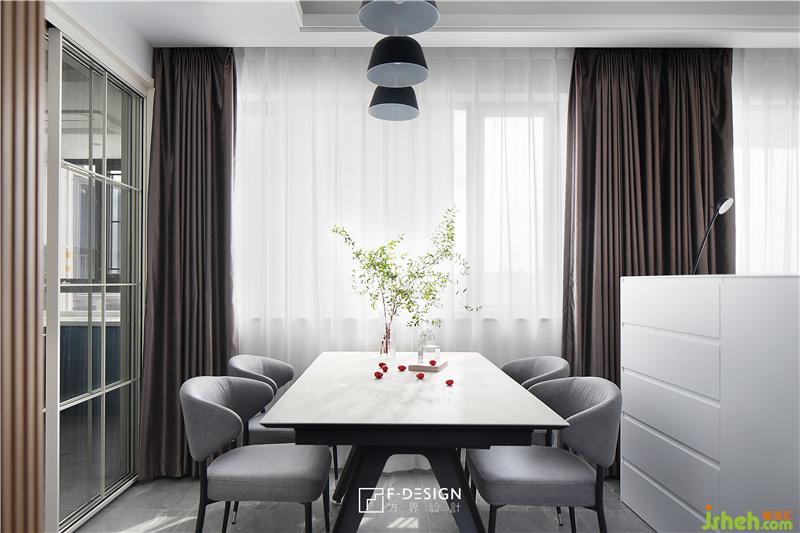餐厅岩板餐桌线条利落,搭配灰色餐椅,舒适大气;餐桌也选用了可以伸缩的桌面长度的功能,多人聚餐的时候也能坐得下。