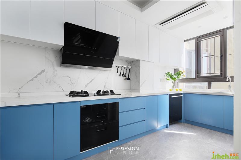 厨房空间增添了业主喜欢的蓝色基调,厨房的功能区分布也很清晰明确,L型橱柜,物品收纳井然整洁有序。