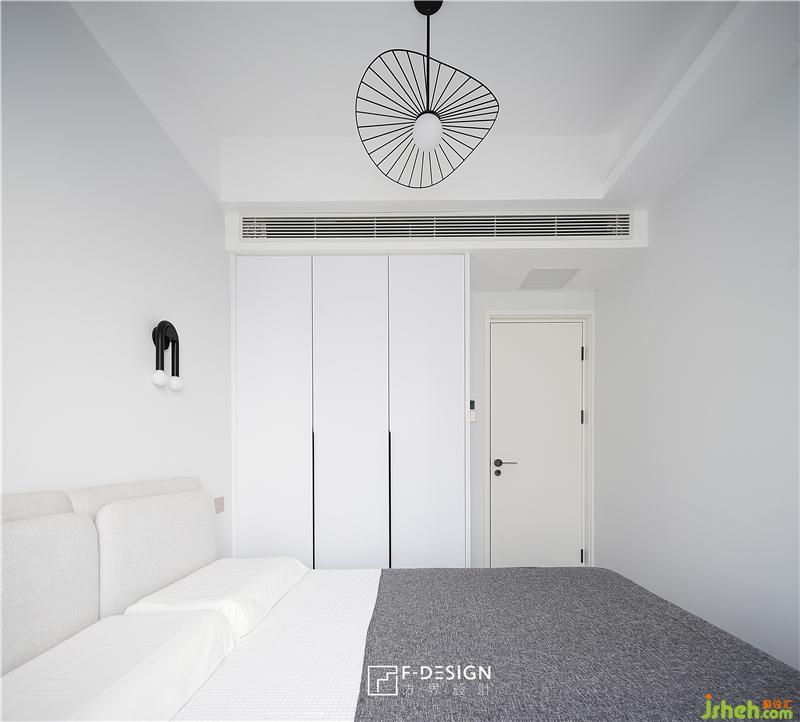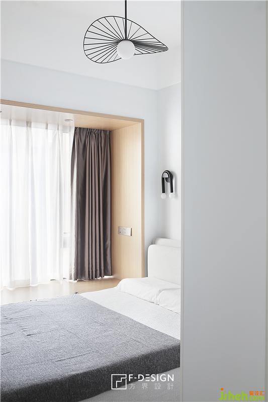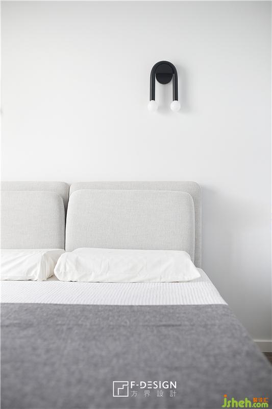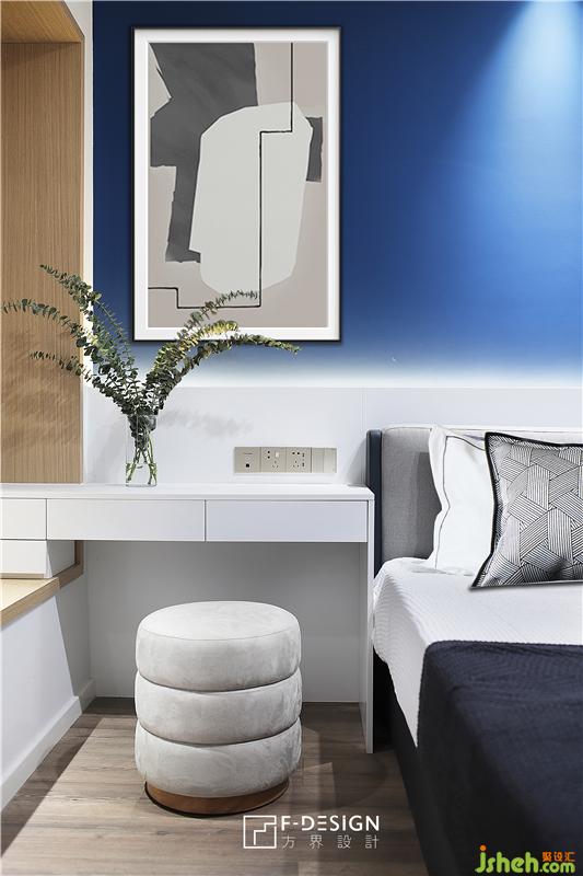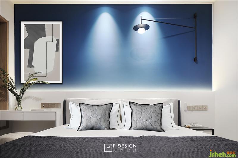主卧,一大扇飘窗,让主卧显得宽敞明亮,空间以柔和的蓝色作为床头背景墙,窗外的夜色也与之相呼应,室内设计师让卧室空间多了一分静谧,变得更具温情。一切以舒适为主,业主能在这样的氛围中更好的放松。