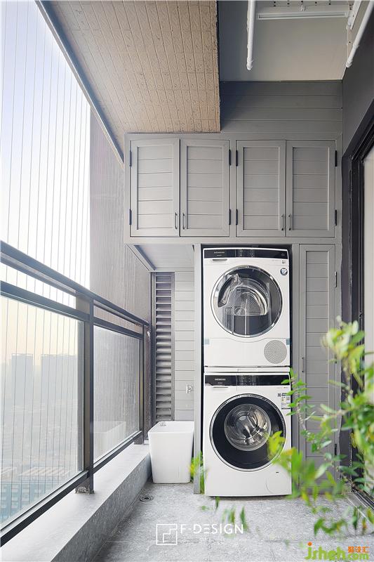 功能阳台,洗衣机加烘干机一起放置,还有定制的柜子,利用空间尽可能做到功能完备,整齐合理。旁边白色的是拖把池,方便业主打理卫生之需。