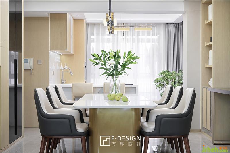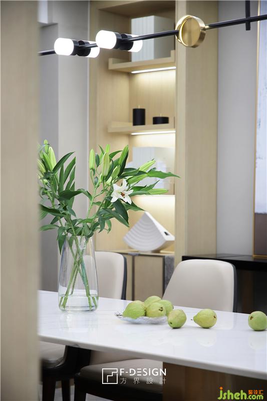 餐厅区域没有做过多的装饰,吊灯点缀空间,搭配石材餐桌,舒适餐椅,整体氛围十足,让平日的一日三餐变得更有仪式感。