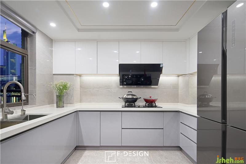 厨房的功能区分布清晰明确,带给人舒适的视觉体验,干净明亮,物品收纳井然,整洁有序。