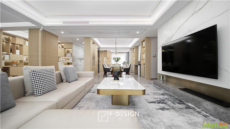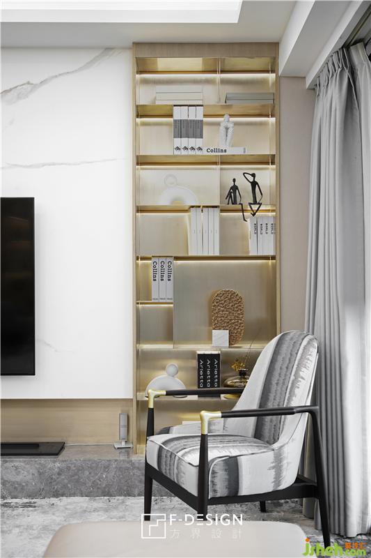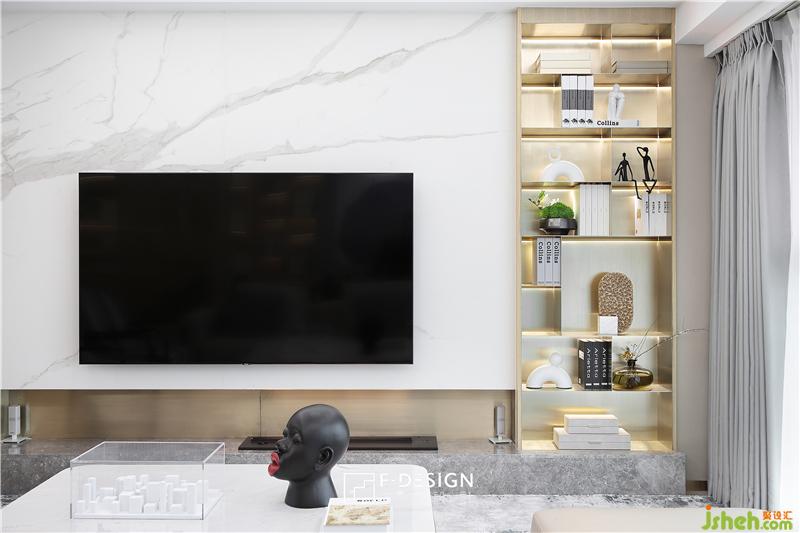 电视背景墙采用充满质感的大理石材质,光洁如镜、大气,而旁设计了一列的展示柜,摆放着错落有致的精致物品。