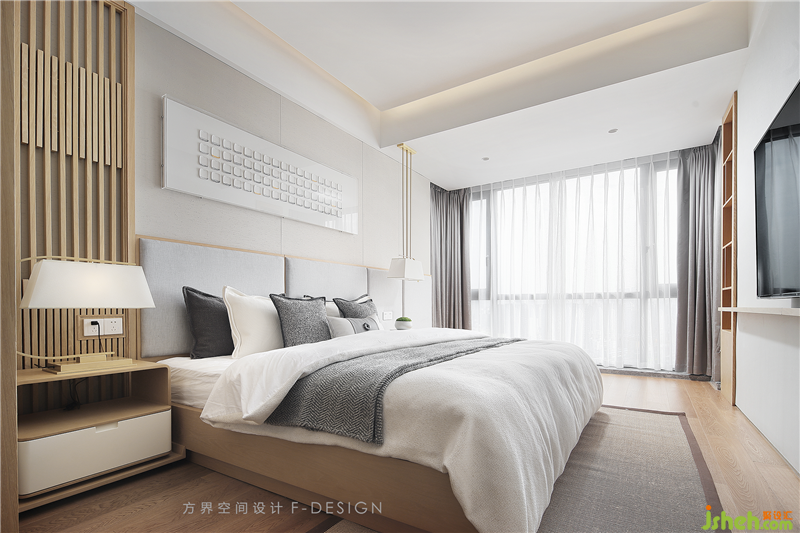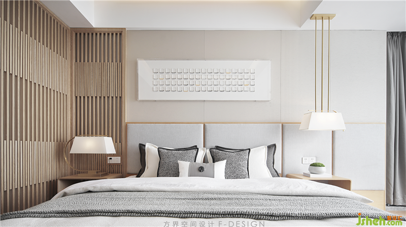 清晖影绰绰,风动一室香。主卧以温润色营造舒适的氛围感,巧妙的通过木格栅弥补了墙面的空白,与主卫、衣帽间做隔断,一弦一柱,细节精美,增添空间的质感。