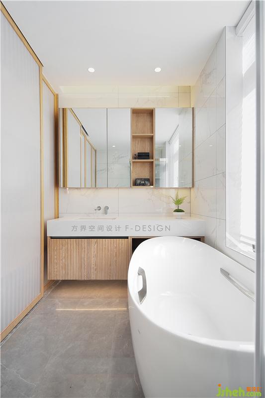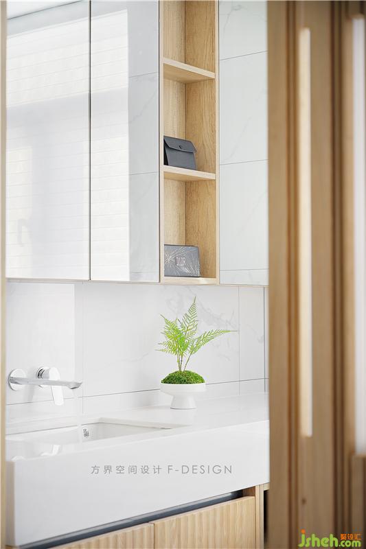 大面镜子让空间看起来更加宽敞,木色的储物格、白色墙面,木质点缀,柔和的色彩表达出空间干净整洁。