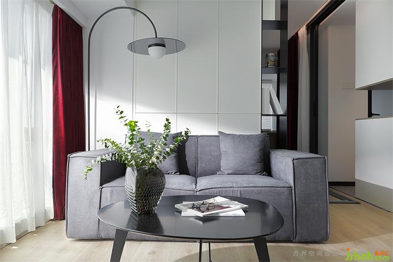 室外阳光明媚,屋内宁静清惬。沙发墙做成了一面实用的收纳柜与功能房一柜之隔。