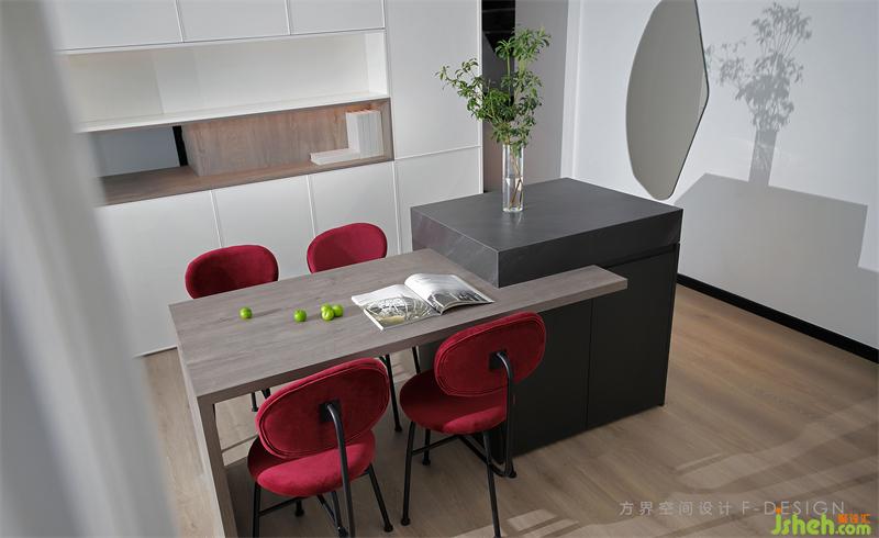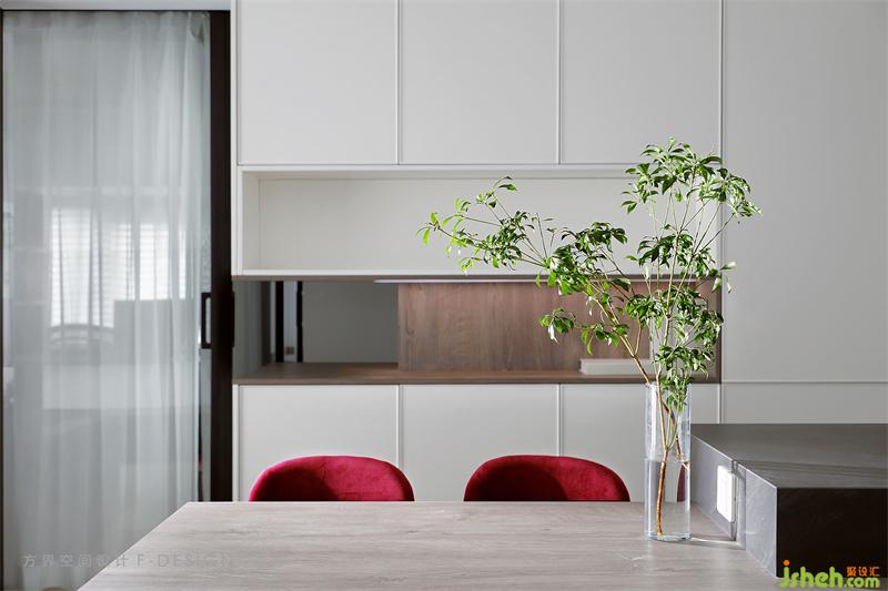 在充满各种诱惑的世界里,用一份平淡克制欲望留下一份热情。客厅的色彩跳跃与留白,线条的曲与直,材质锐利与柔和。把红色运用到空间里面整个风格如平静里的躁动。