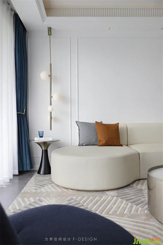 客厅是宽敞大方的格调,依旧是白色的主色,点缀蓝色的窗帘和沙发。作为重要的交流和会客空间,在功能和美学上都达到了统一。纳入自然光线的大面积玻璃窗,让光线在空间中肆意流淌,时间缓步前行。