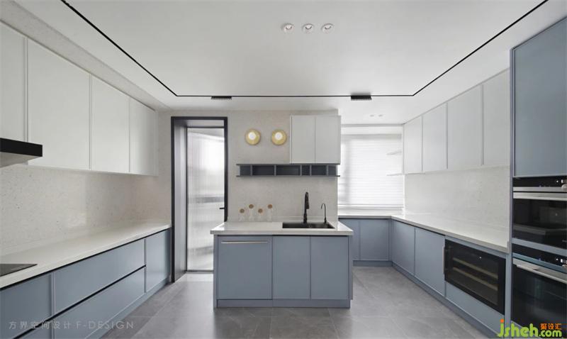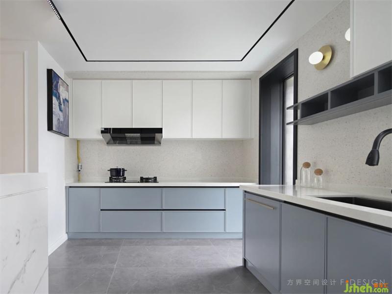 厨房是现代化开放式的格局,有质感有层次。不仅有简单的餐台,吧台式的设计现代感十足。墙上隐藏的照明灯,隐隐约约突出了设计感。