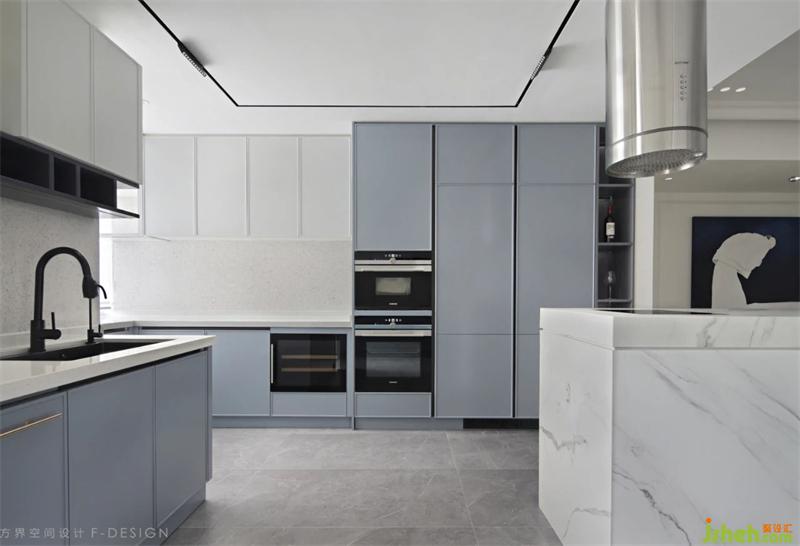 洗碗机和冰箱做了嵌入式的手法,冰箱加上柜门隐藏起来了 。岛台做了个西厨的作用,圆筒抽烟机下方是电磁炉准确的抽烟。中西结合的厨房对于一个喜欢做饭的女士来说是必备的。