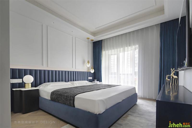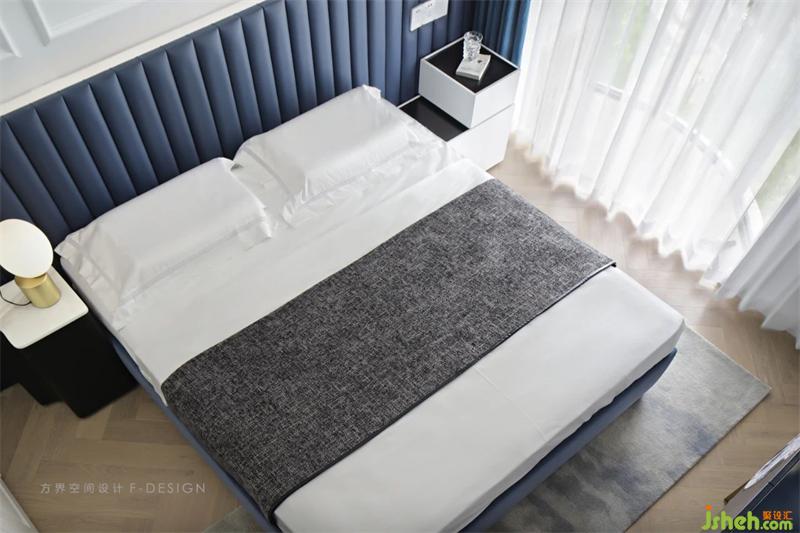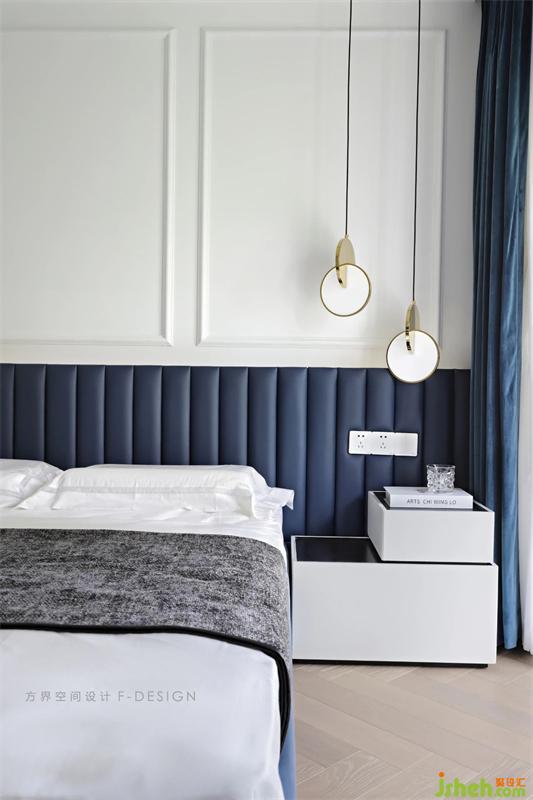 主卧室空间,线条分割以床背景高度为分界,用PU线条平均划分墙面,采用蓝色色调来表现空间。