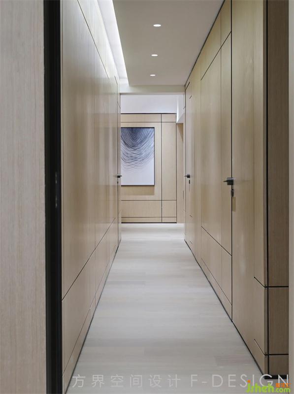 原木的搭配高级质感又温柔雅致。在筒灯的基础上旁边再加一排反灯槽保证走廊的光线。