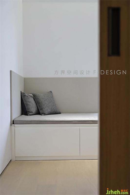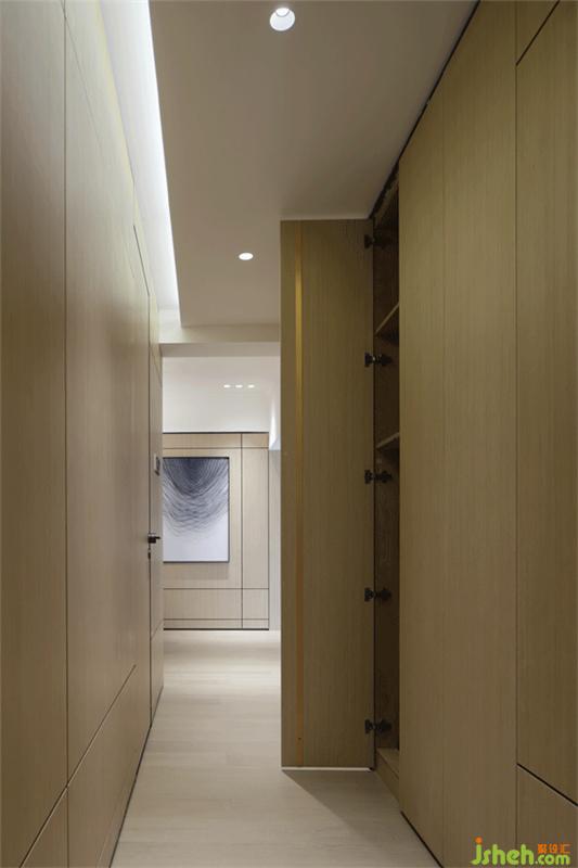 走廊内推一点空间做了隐形的生活收纳柜,回弹的柜门使走廊为一整体一面墙 。