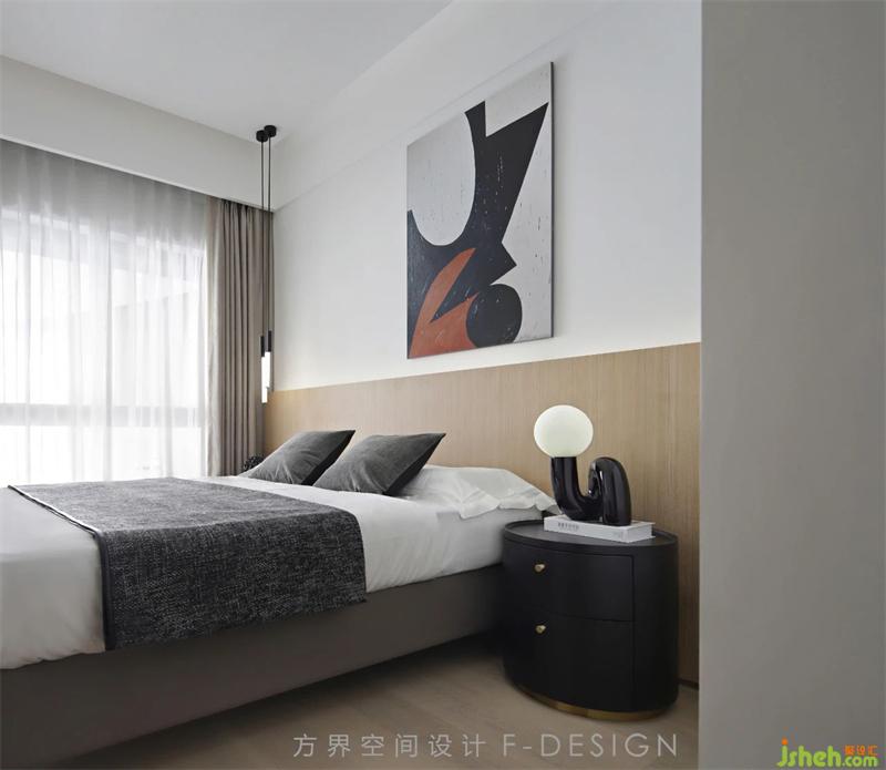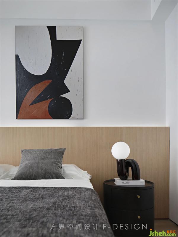 卧室的实木质感的木地板,让整体的睡眠空间更加温暖细腻。床头的艺术挂画在空间起到了画龙点睛的作用