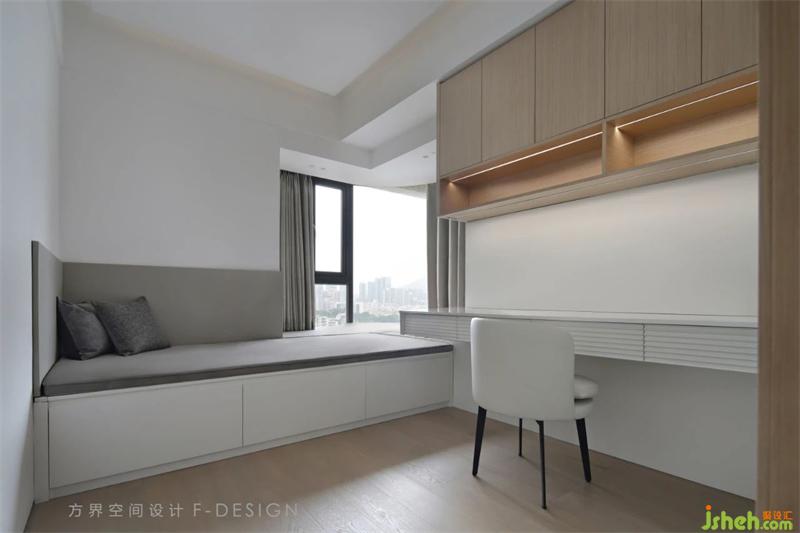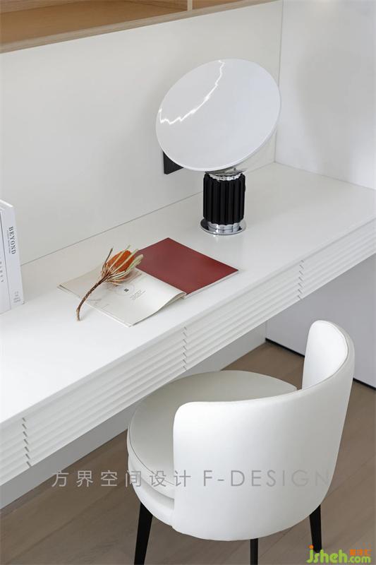 挂壁的书桌的抽屉设计成波纹格栅在极简的空间做出细节的独特。