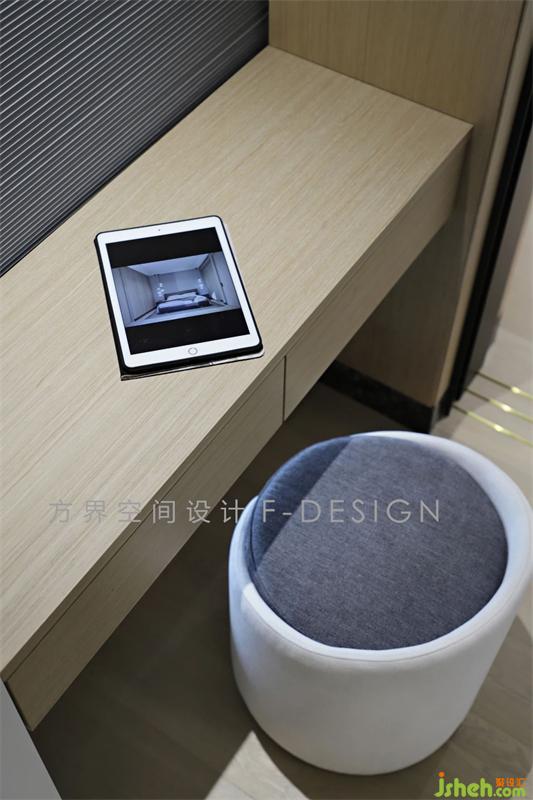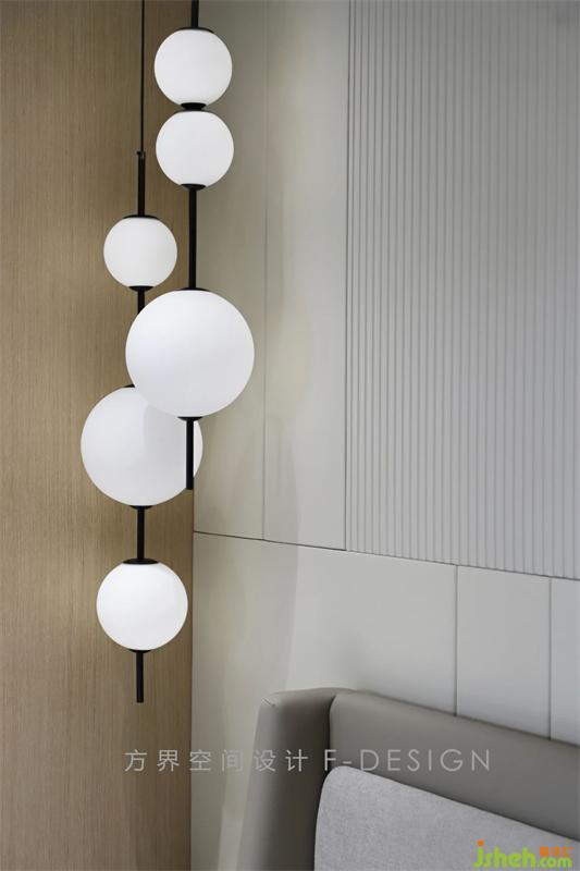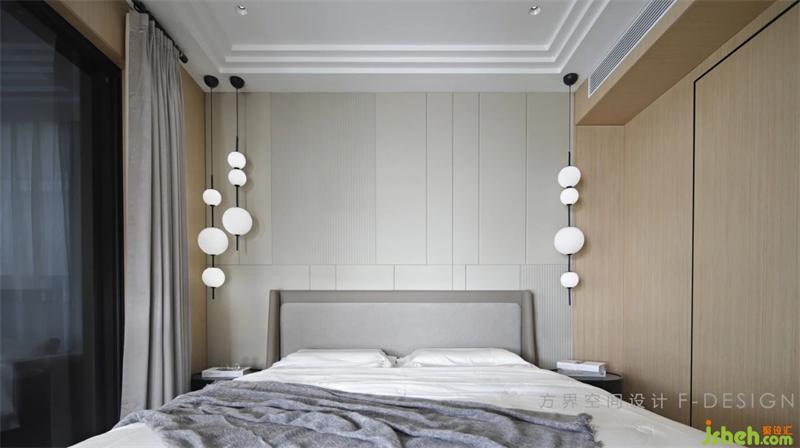 床头背景墙用朦灰皮革硬包减弱白色的明亮度,使卧室达到舒宁的睡眠空间。跳几格格栅纹打破矩形平面的规整