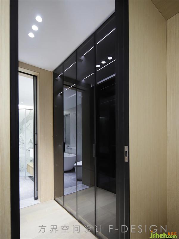 干净利落的衣帽间,与卧室推拉门有个呼应。镀膜玻璃柜门高级耐看,镜面的反光还可以折射扩大视觉空间。内置感应灯找衣服的时候更方便明确,一切都让业主享受生活惬意。