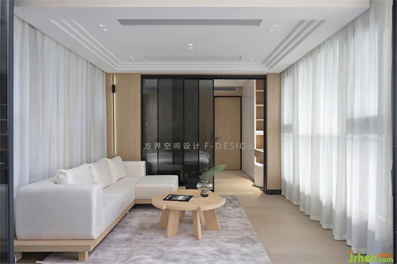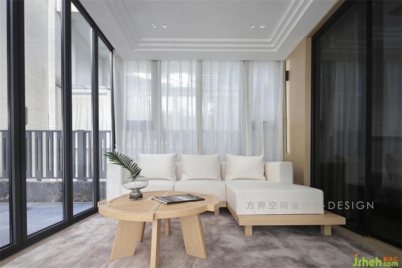 外面是开放式的阳台种上绿植,打开休闲空间的折叠门两个空间互通躺在沙发上看着杂志享受自然气息的温韵。横向的原木护墙板让空间更清爽凉意,仿佛置身户外。