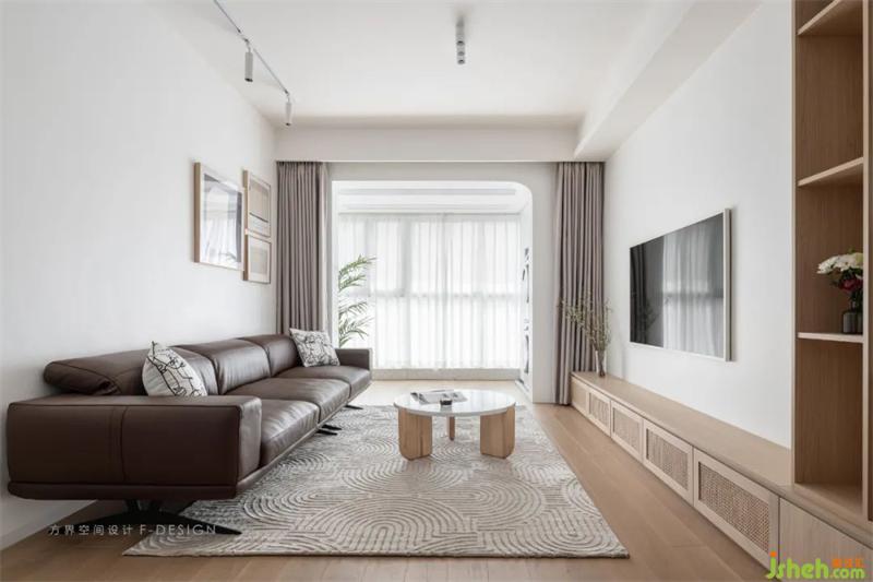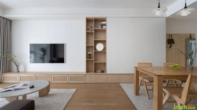 电视墙一半做一整排的收纳柜,满足家庭日常杂物收纳;深圳家居设计开放格与封闭柜搭配,满足更多的收纳场景。另外一半是留白,让空间更加开阔。