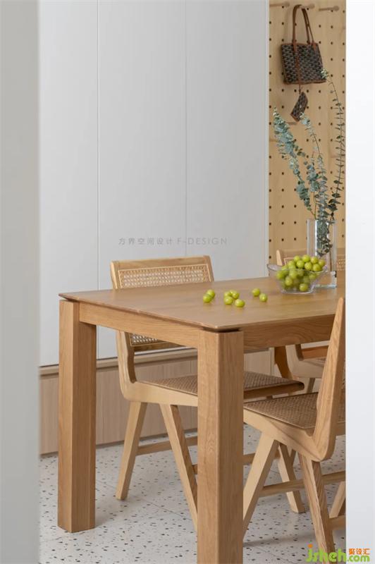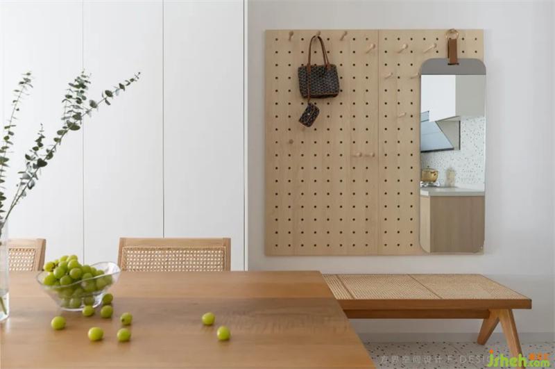 玄关见证了时间的流速,也参与一家人的生活。原木与白搭配,温暖空间氛围,给归家时刻,缓解疲惫,舒心放松。
