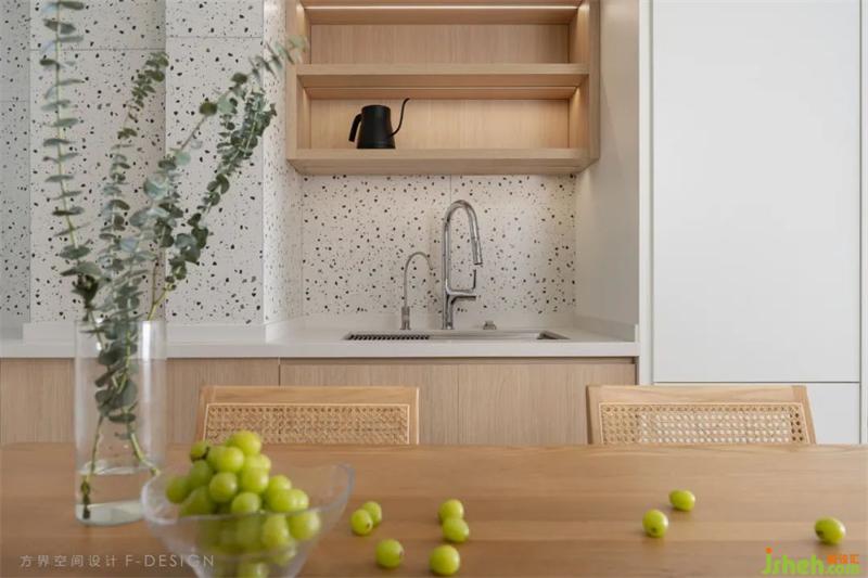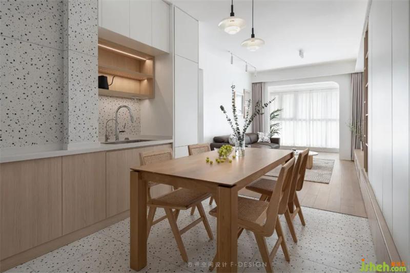 The dining room and the living room are located in the same space, separated by wood floor and terrazzo. The open space design gives people a more open visual experience, and the wooden table adds warmth to the space. The decoration on the wall enriches the details of the space and shows the exquisite beauty.