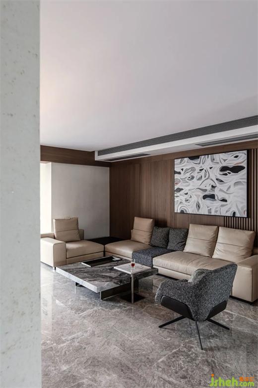 沙发运用皮质与布料完美结合的精湛工艺,华润幸福里公寓设计通过力学和美学的完美融合,塑造舒适体验和超凡气质