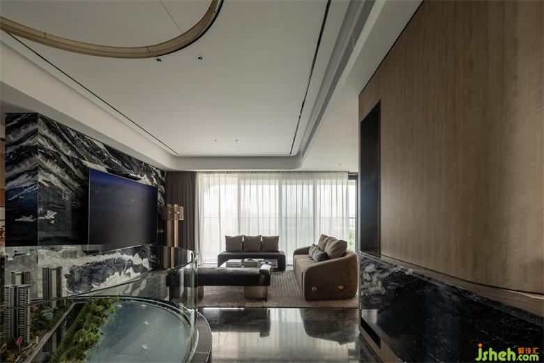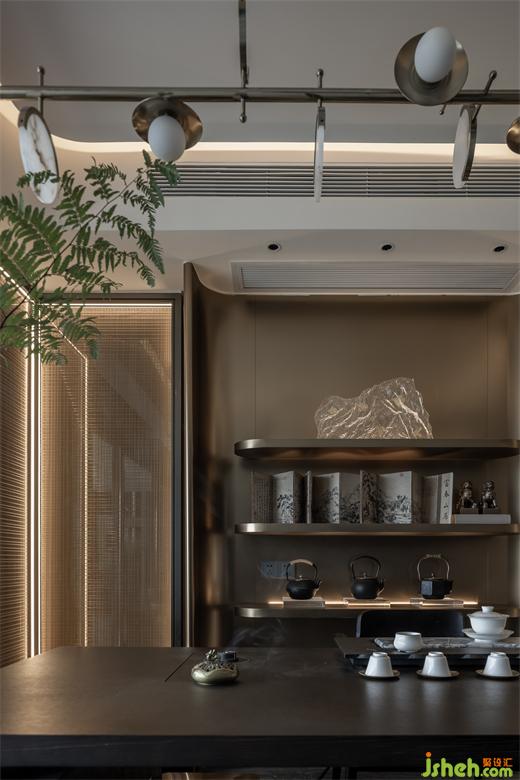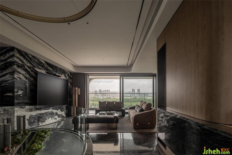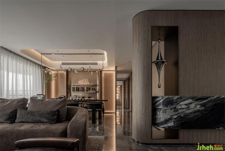 室内连续的深色木作一改厚重的姿态,似轻盈般铺陈开来。明与暗,深与浅、柔软与粗放构成生活区灵动的形式语言。