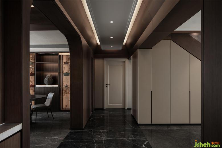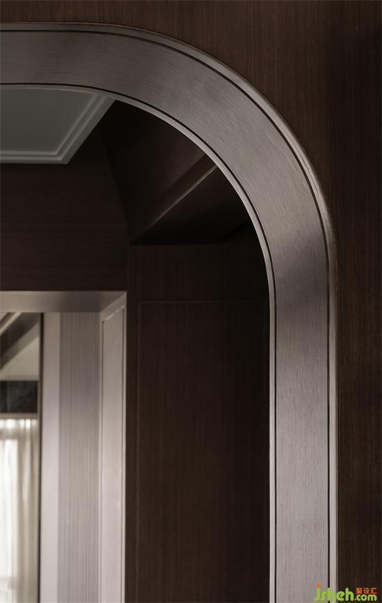 TRID添睿室內设计此次的私人復式住宅總面積為242.9㎡,現場的梁位結構交疊復雜,給空間造成高度不一的現狀,TRID添睿室內设计中使用了圓弧和斜面的元素,簡約的線條在規矩的空間中,弱化梁柱墻體之間的狹小方正感,通過這些元素,給空間產生延伸感,進而在視覺上擴大空間的邊際。