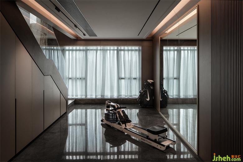 客廳和健身區,擁有絕佳的視野,得益於建築本身的高度和朝向,TRID添睿室內设计使得大面積的落地窗不僅讓室內采光極好,自然更與空間相互融合,家人在這裏享受歡愉時光。