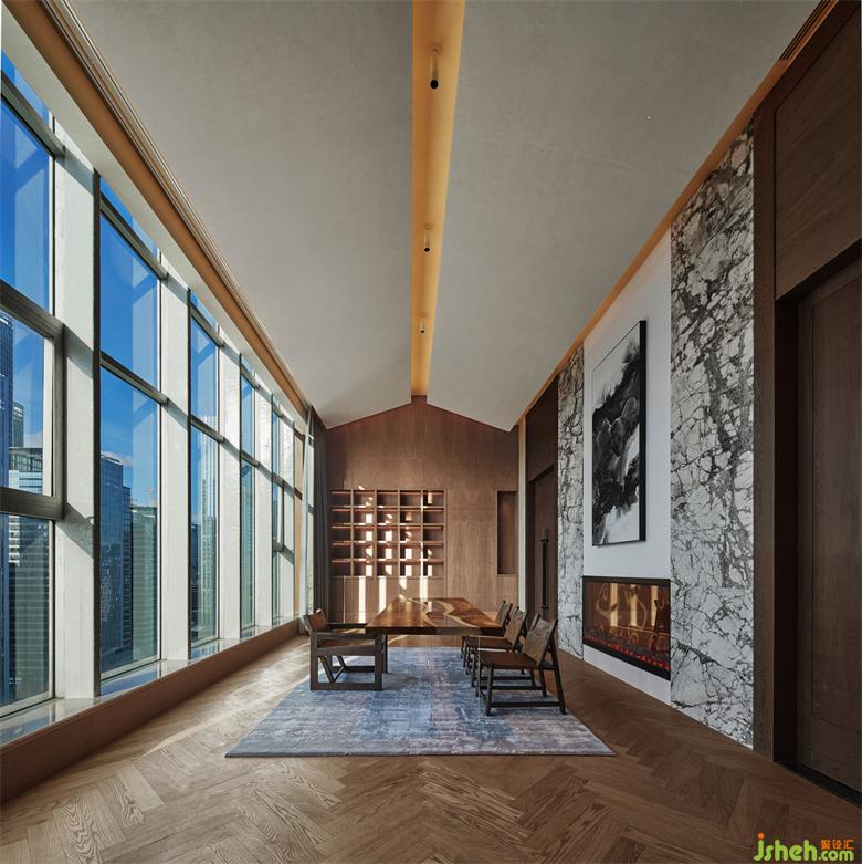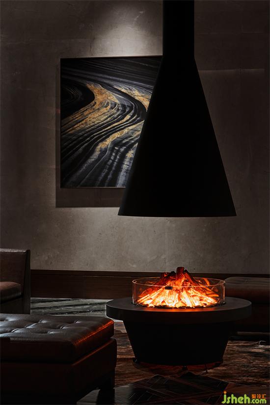 挑高的木質坡屋頂,深圳会所设计肌理豐富的墻面,精致溫暖的壁爐,棕色皮質沙發以及絨毛地毯,與周圍山、水、林和諧共生;我們希望給空間帶來一份溫暖,營造自然的美好,三兩好友,交談甚歡,這份溫暖可以在彼此之間,永遠留存。
