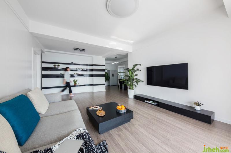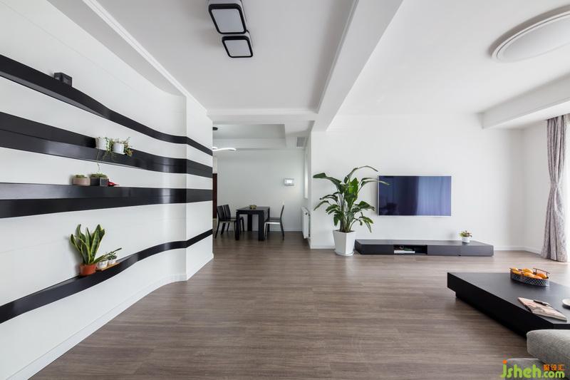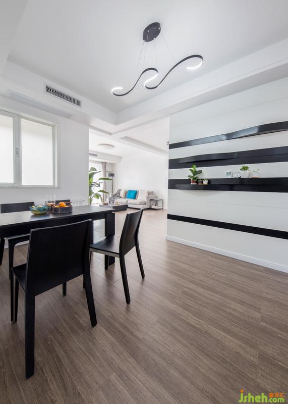 进门正对着的是餐厅背景,整个餐厅背景的设计灵感来自于金都汉宫原有建筑外立面,黑与白的线条交错延续到客厅,让原本分开的客餐厅的结合成一个整体,流线型的造型简单明了,干净利落,犹如长江滚滚流水气势磅礴,采用黑色的家具与背景做搭配,让整个空间形成经典的黑白配色百看不厌。