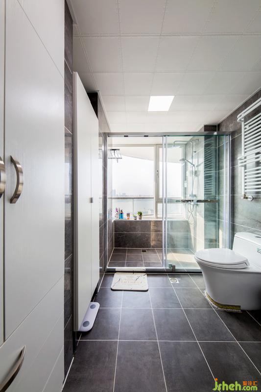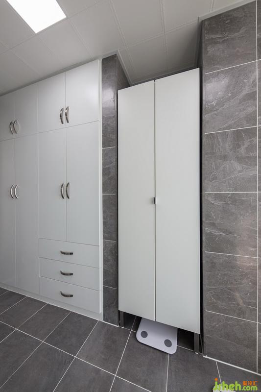 卫生间干湿分区,颜色上使用了白色的浴室柜搭配灰色系的墙地砖,不仅显得干净还耐脏易打扫。